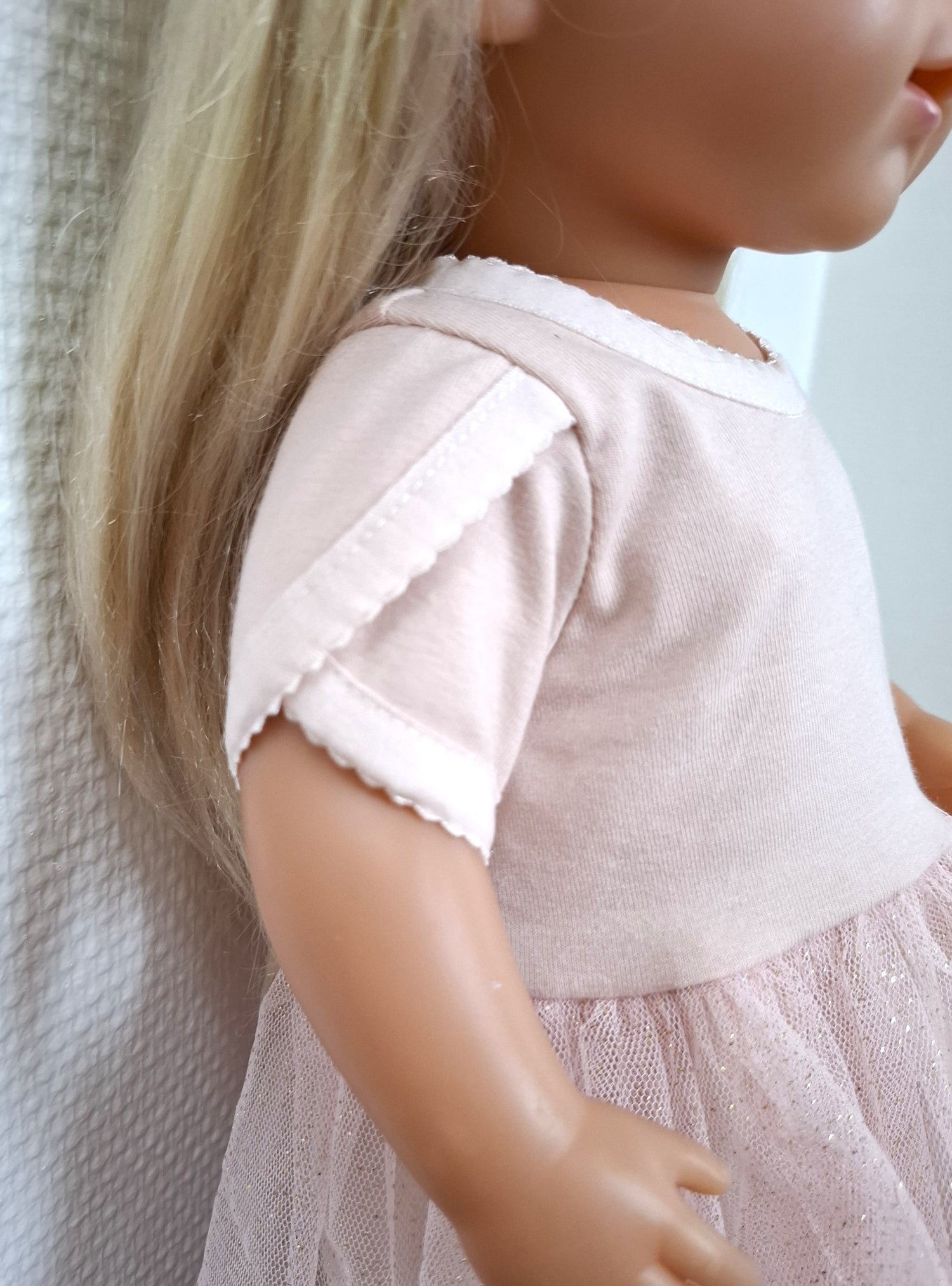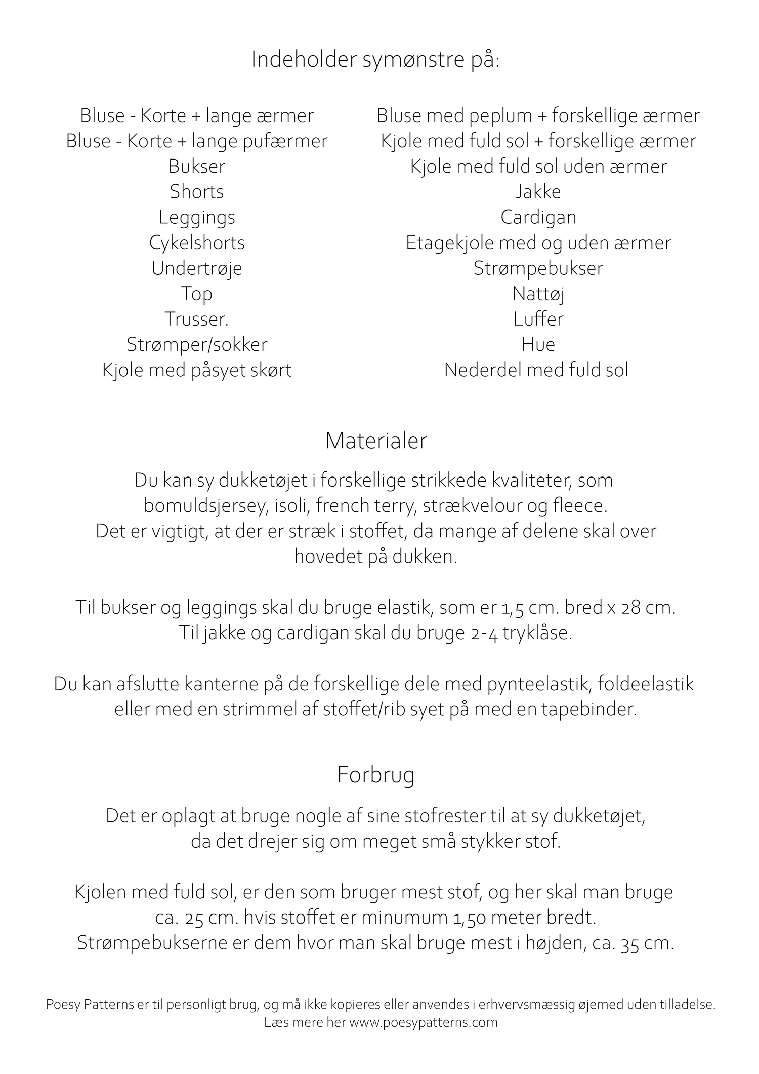 Du kan sy tøjet i forskellige strikkede kvaliteter. Det er vigtigt at der er stræk i stoffet, da meget af det skal over dukkens hoved.