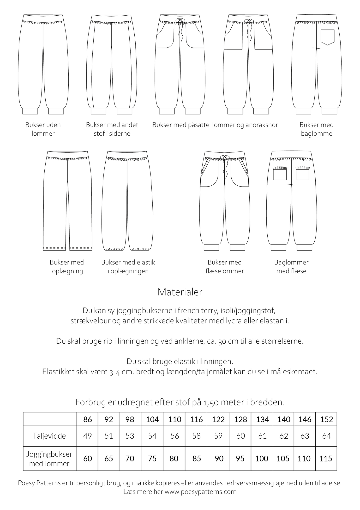 Du kan sy joggingbukserne i bomuldsjersey, isoli, french terry, strækvelour og andre lidt kraftige strikkede kvaliteter, hvor der er lycra eller elastan i.