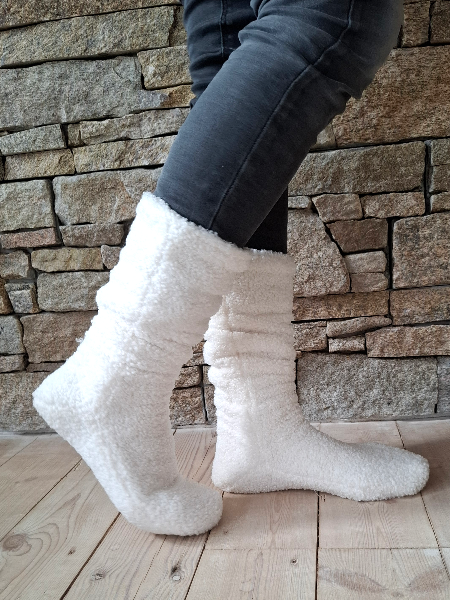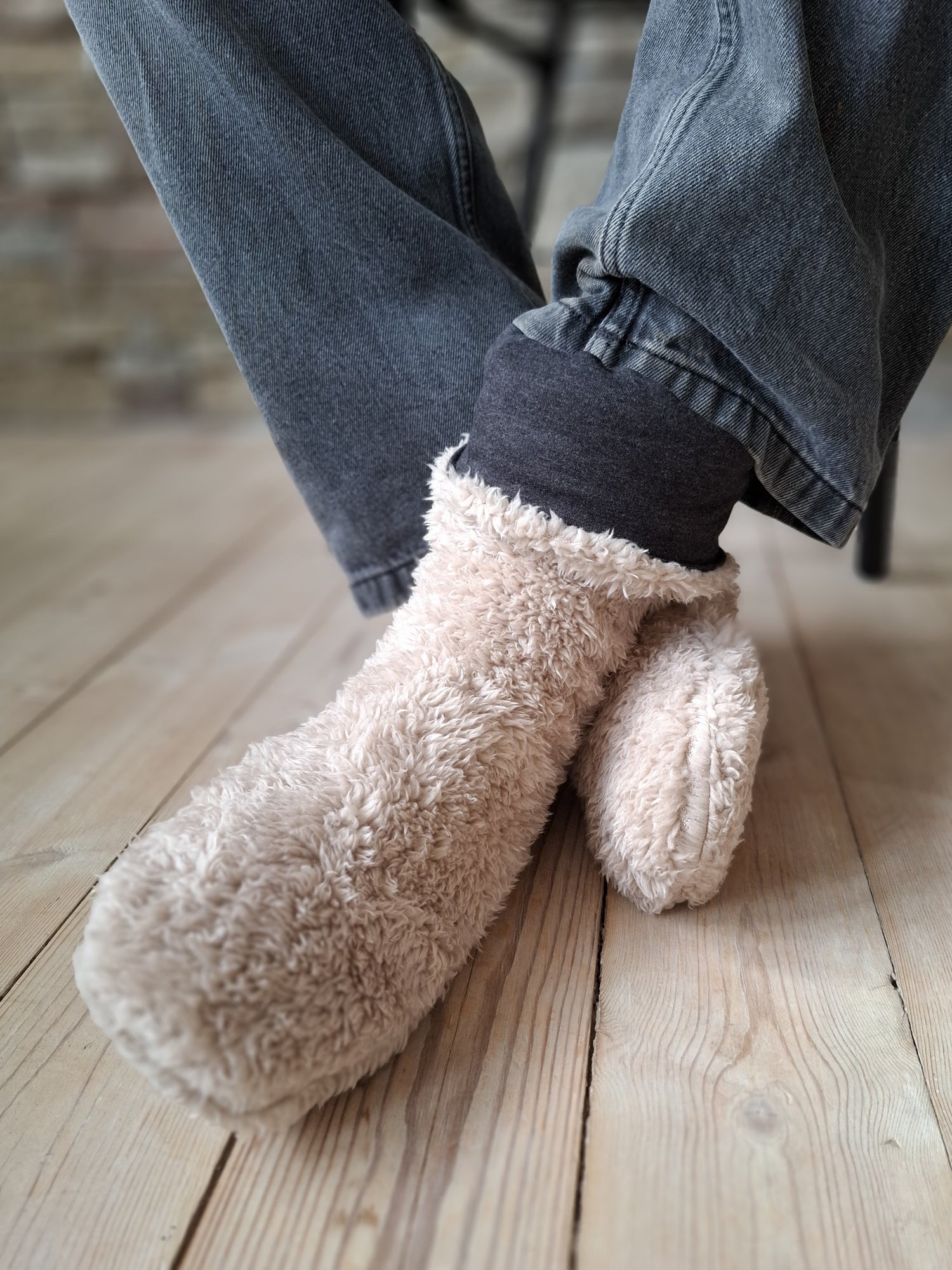 Start evt. med at sy en enkelt sok i ét lag og prøv den på. Husk, at den bliver lidt mindre, når de to lag bliver syet sammen.
