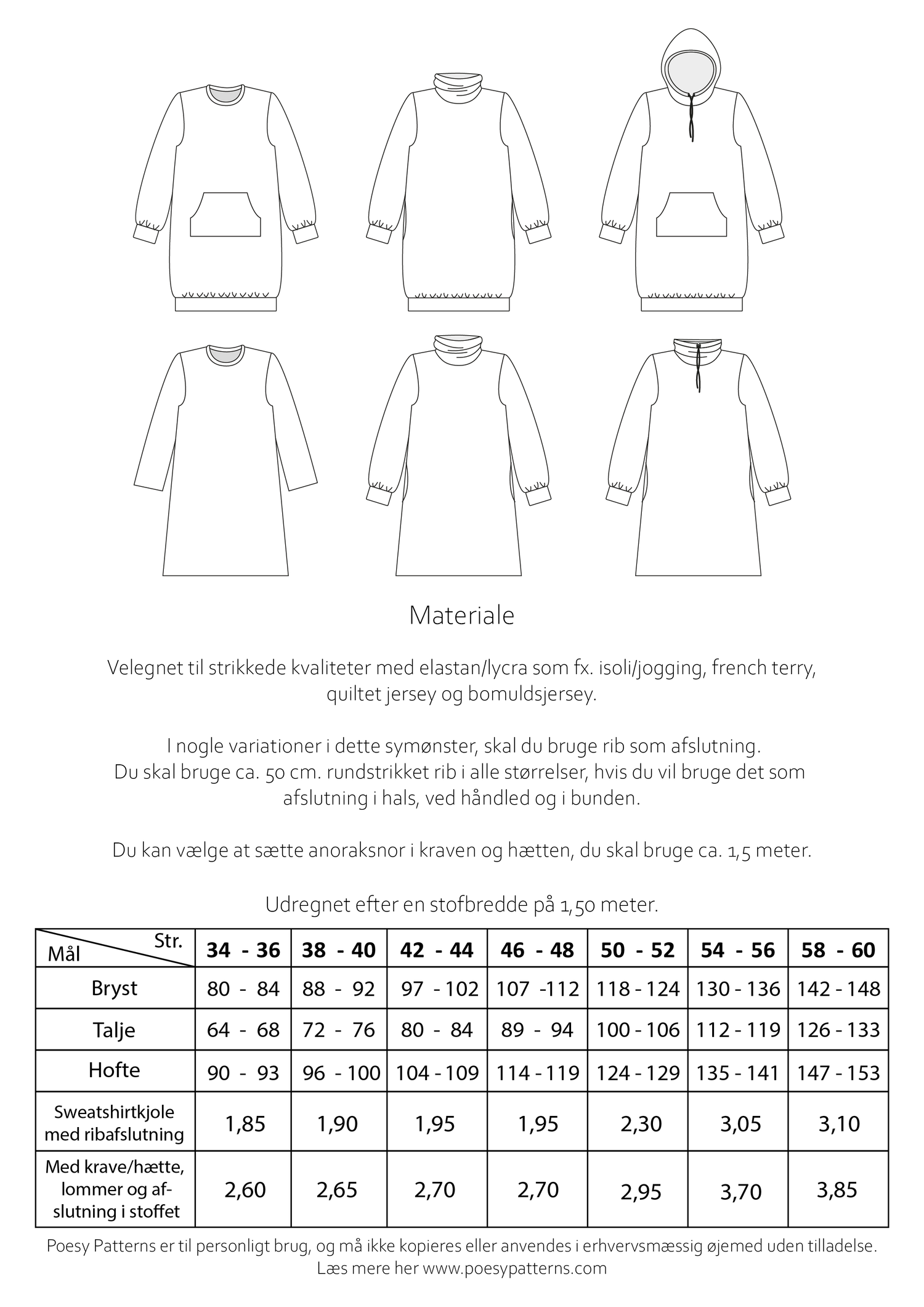 Sweatshirtkjolen kan syes med rib i halsen, en høj krave i to forskellige højder eller med en hætte.